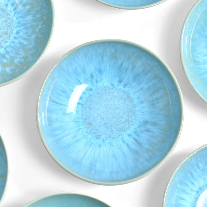 Émail : Bleu água, un émail bleu turquoise peps et réactif appliqué à l’intérieur de la pièce. Mixé avec un émail blanc réactif légèrement moucheté sur l’extérieur.