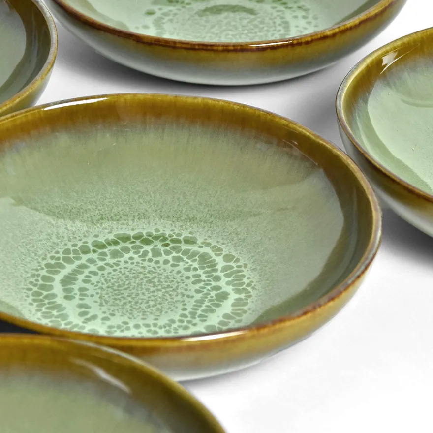 Émail : Un émail vert kaki réactif légèrement acidulé avec des effets mouchetés à l’intérieur, agrémenté d’un liseré marron plus ou moins foncé sur le rebord de la pièce.