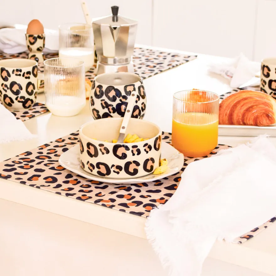 Chaque tache est appliquée à la main, à l’éponge, dans un geste libre et instinctif. Un motif vivant, jamais figé, qui rend chaque pièce unique. L’élégance du léopard, revisitée par la main de l’artisan.