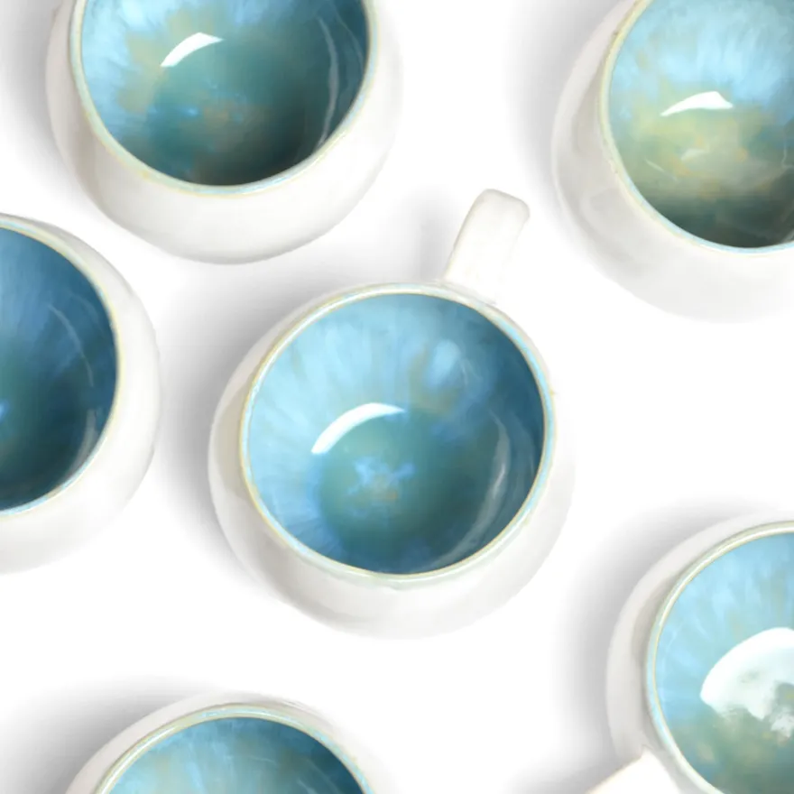 Émail : Bleu água, un émail bleu turquoise peps et réactif appliqué à l’intérieur de la pièce. Mixé avec un émail blanc réactif légèrement moucheté sur l’extérieur.