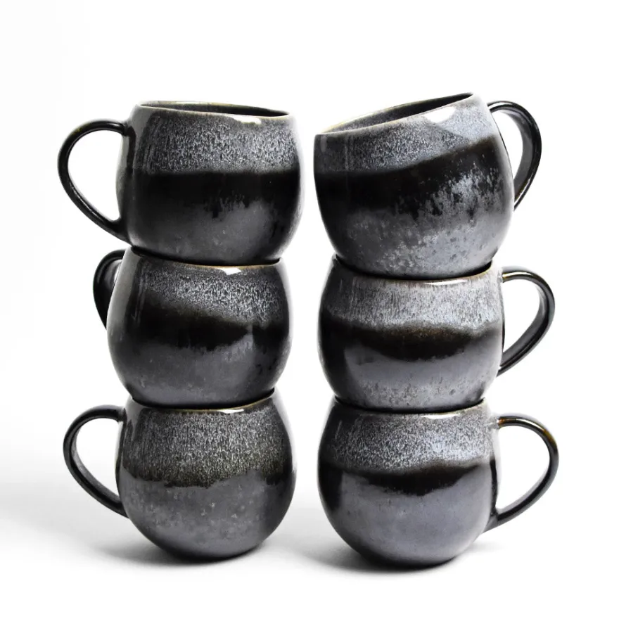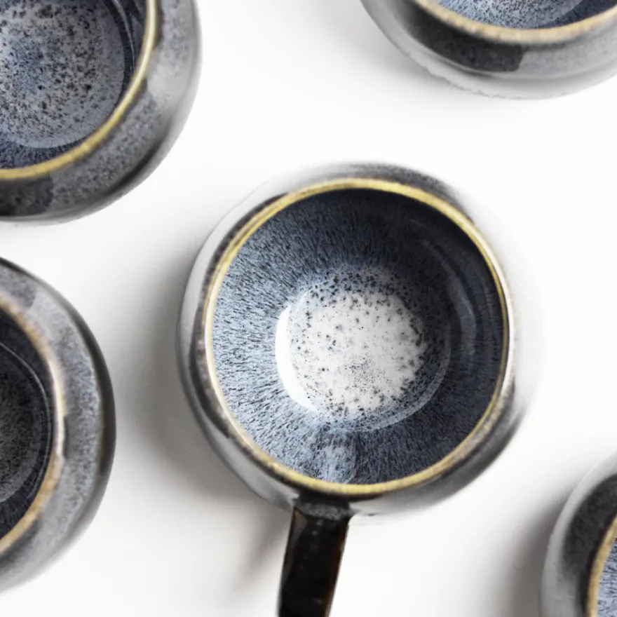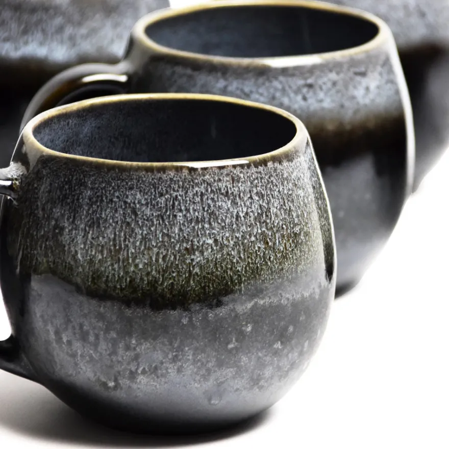 Émail : Un émail noir mat sur l’extérieur des pièces avec des effets réactifs blancs / bleutés brillants sur l’intérieur.