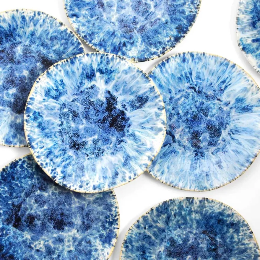 Émail : Le Bleu Écume capture le mouvement de l’eau et la lumière changeante des vagues. Les nuances se fondent en transparences et dégradés, évoquant le va-et-vient de la mer sous le soleil.
