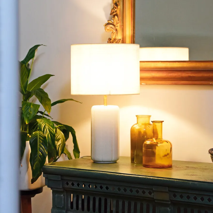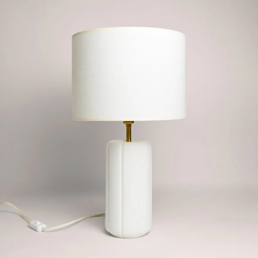 Abat-jour en coton blanc et pied en céramique blanc. Une lumière douce et apaisante, comme un matin d’hiver au soleil.