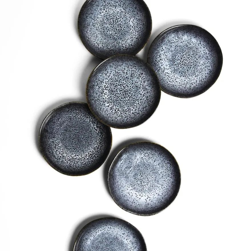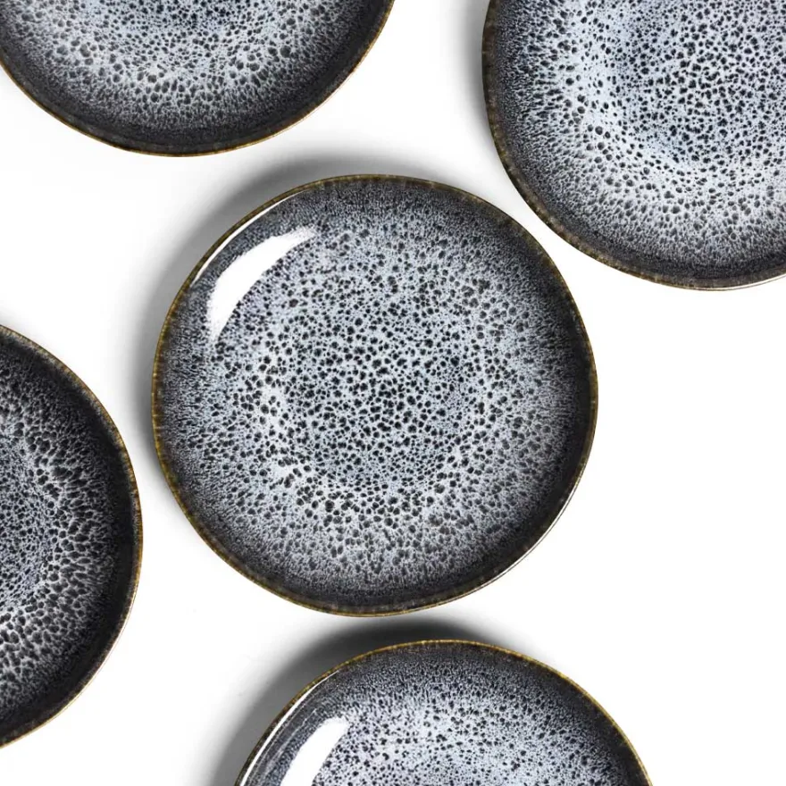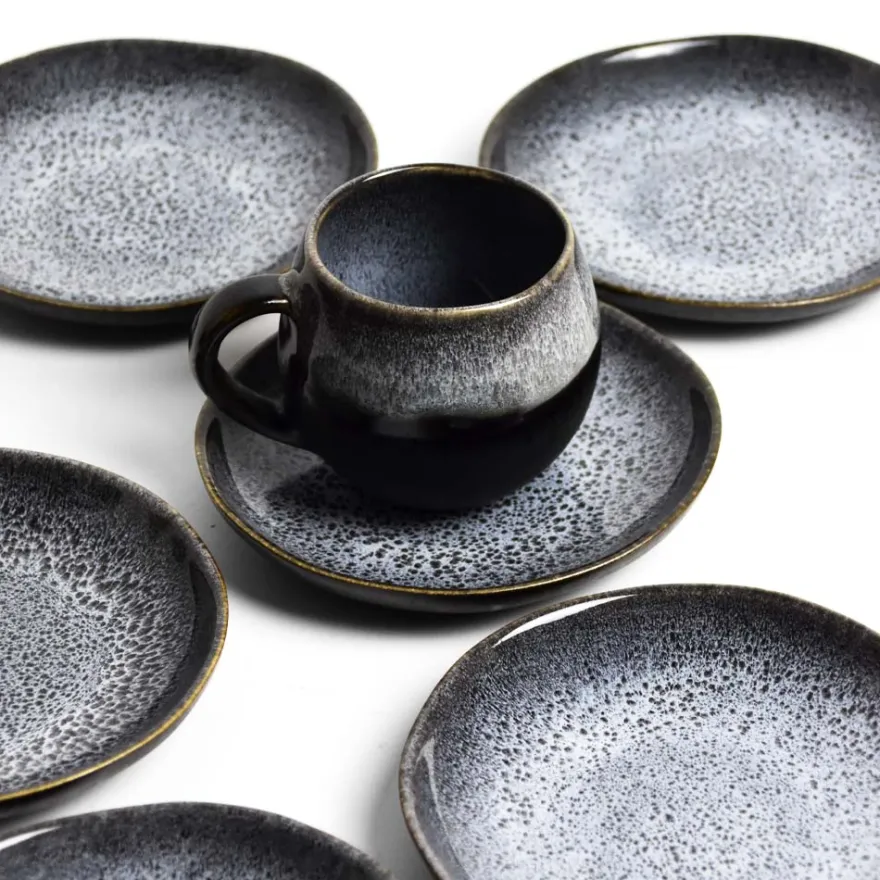 Émail : Un émail noir mat sur l’extérieur des pièces avec des effets réactifs blancs / bleutés brillants sur l’intérieur.