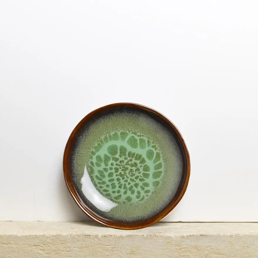 Émail : Un émail vert kaki réactif légèrement acidulé avec des effets mouchetés à l’intérieur, agrémenté d’un liseré marron plus ou moins foncé sur le rebord de la pièce.