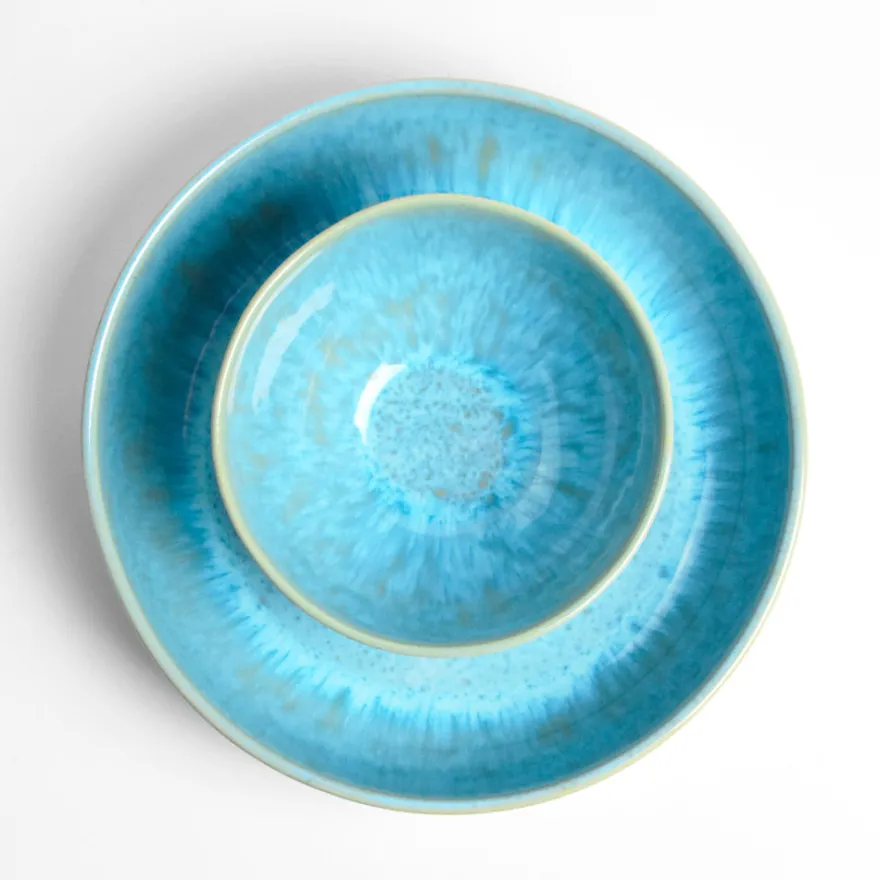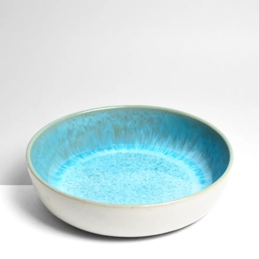 Émail : Bleu água, un émail bleu turquoise peps et réactif appliqué à l’intérieur de la pièce. Mixé avec un émail blanc réactif légèrement moucheté sur l’extérieur.