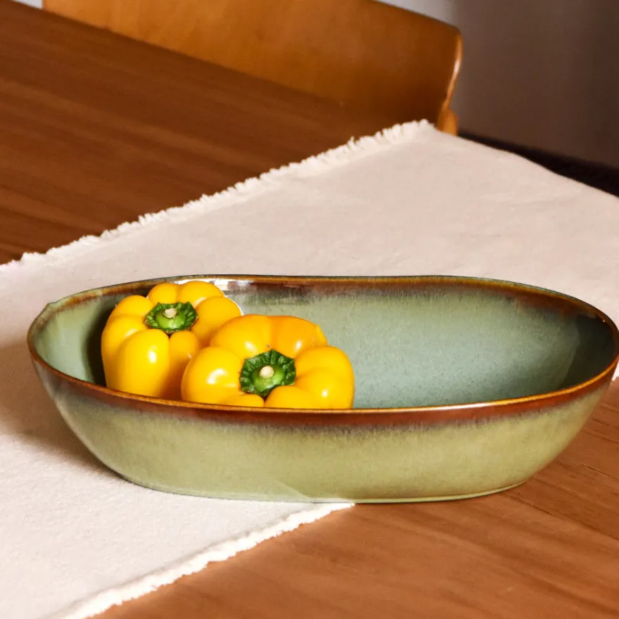 Avec son format allongé, ce plat en grès met en valeur tout ce que vous y déposez, comme un véritable bouquet de saveurs. Idéal pour présenter des légumes rôtis ou quelques fruits de saison au centre de la table, il ajoute une touche élégante à vos repas.