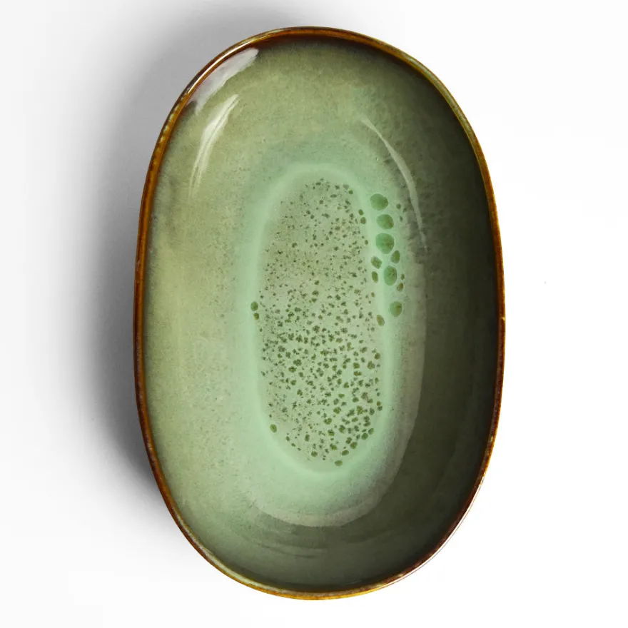 Émail : Un émail vert kaki réactif légèrement acidulé avec des effets mouchetés à l’intérieur, agrémenté d’un liseré marron plus ou moins foncé sur le rebord de la pièce.