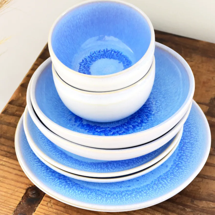 Émail : Un bleu profond, entre lapis et azur, qui prolonge l’été sur vos tables. Chaque pièce révèle des effets de matière uniques, entre éclat brut et douceur minérale.