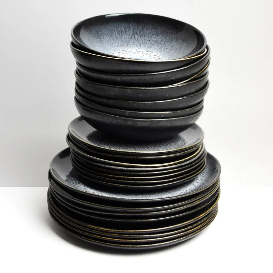 Émail : Un émail noir mat sur l’extérieur des pièces avec des effets réactifs blancs / bleutés brillants sur l’intérieur.