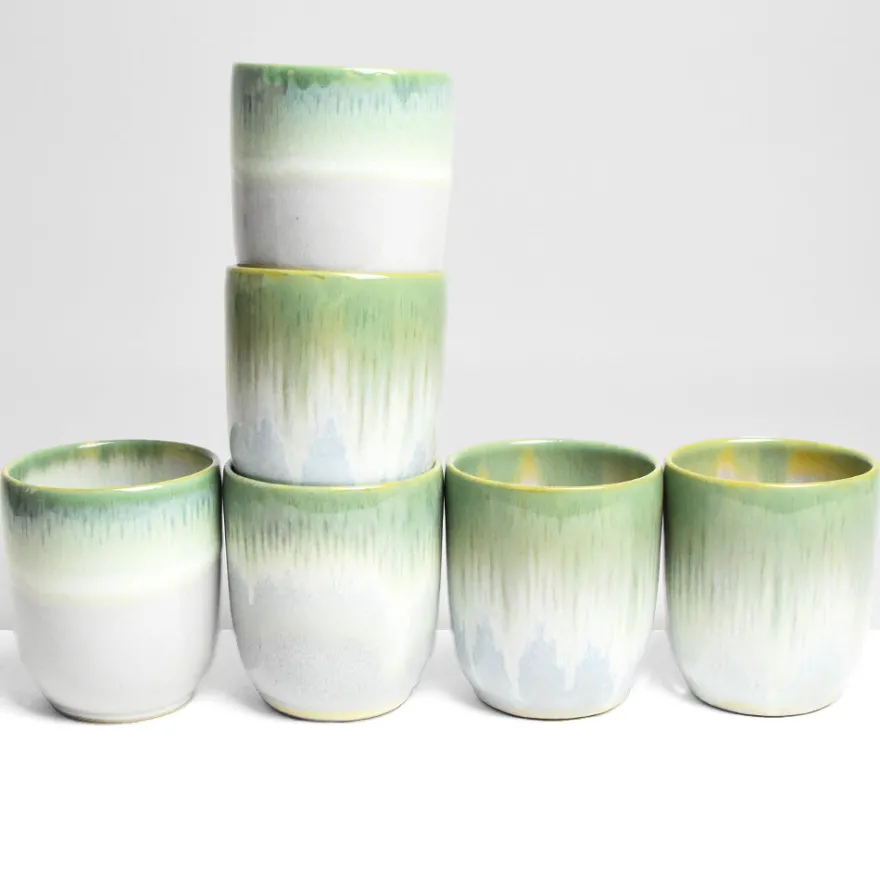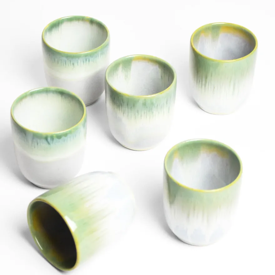 Émail : Un émail vert clair réactif appliqué par trempage laissant apparaître une coulure plus ou moins régulière sur le haut de la pièce, associées à un émail blanc / beige aux couleurs de l’argile sur le bas de la pièce.